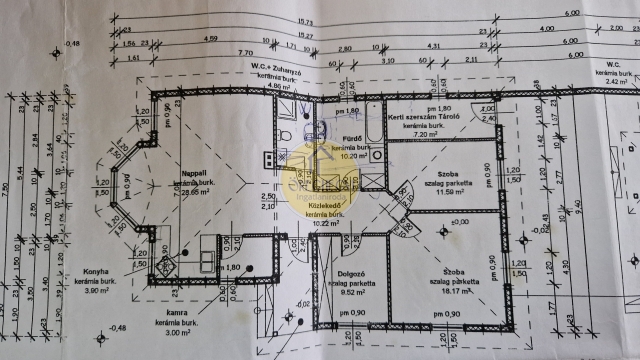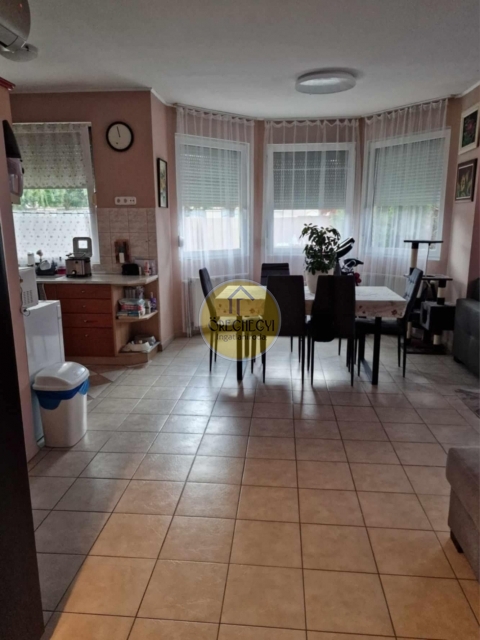 Az utca fronthoz közeli ház - jelenlegi fotók szerint - "A" jelű lakóház 300 m2-es telken : 100 m2-es, 3 szoba nappalis, amerikai konyhás, 2 fürdőszobás - egy kádas és egy zuhanyzós- tároló, fedett terasz, és igény esetén egy gépkocsi tároló. Ir.á: 80 mft